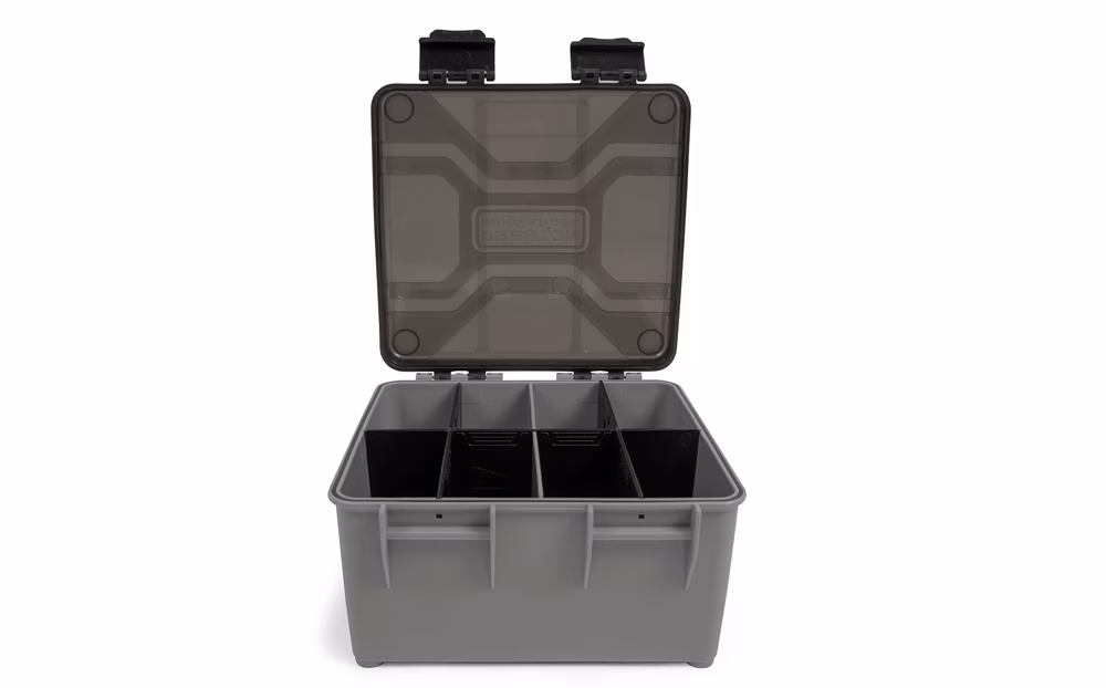 Preston Innovations Hardcase Accessory Box XL. Perfect for keeping a wide array of accessories safe and secure from delicate pellet wagglers and pole floats through to feeders. The Hardcase Accessory box is secured with two positive clips which in conjunction with the TPE gasket help to keep the contents of the box dry. The three sectioned divider supplied is ideal for separating out different styles of feeders or floats and can be removed entirely if required leaving a larger individual space.