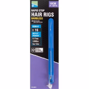 KKM-B Rapid Stop Hair Rigs Barbless. The Mag Store System Rigs take hooklength design to the next level. They're constructed from the highest quality materials, and tied to precise specifications to create rigs suitable for all anglers. The fully loaded rig stick can be taken straight out of the packaging and placed into the correct sized Mag Store System Box. Each pack contains 8 hand tied rigs which are stored on the rig stick, hook size along with line diameter and breaking strain can be easily identified by the attached sticker. KKM-B hooks are used on each rig, tied to the tried and tested Reflo Power line. A Bait Band or Rapid Stop complete the rig, making them suitable for hair rigging a multitude of baits.