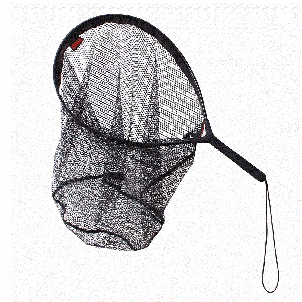 Rapala Single Hand Net has a shorter handle. The soft grip handle also has an elastic lanyard. The rubberized mesh is safe for the fish.