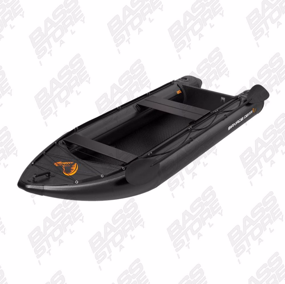 Kayak da pesca gonfiabile Savage Gear E-Rider Kayak 330 ultra stabile, maneggevole e con ridotto attrito nell'acqua. Dotato di pagaia da 260 cm smontabile in 3 sezioni, supporto per motore elettrico o a scoppio, pompa di gonfiaggio e kit di riparazione.