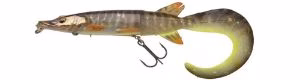 Savage Gear SG 3D Hybrid Pike, swimbait con corpo rigido e coda a grub. 3D Hybrid Pike è un imitazione di luccio super realistico con una coda morbida curl che produce vibrazioni anche se recuperata lentamente. Quando la coda è avvitata sulla verso il basso, durante il recupero la "forza verso l'alto" spingerà la testa dell'esca verso il basso, mentre quando la coda è avvitata verso l'alto, la forza tenderà a tenere l'esca in superfice con la testa in alto - così la swimbait viene in superficie e scorre proprio sotto la superficie creando un effetto scia. Il sistema di sgancio dell'ancoretta rendrà il combattimento con il predatore più sicuro grazie alla girella molto resistente incorporata sull'anello. Nella confezione è compresa una coda di ricambio.