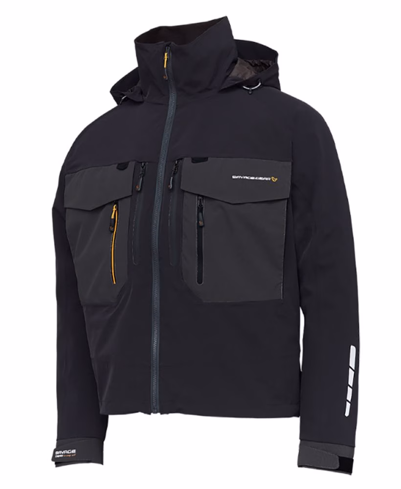 Savage Gear Wading jacket. Raging winds, torrential downpours, Toray Dermirzax high performance fabric powerful waves and spray – it will all become a walk in the park for you with our SG6 Wading jacket. Featuring a Toray Dermirzax fabric that offers incredible durability, protection from the wet and the cold, and flexibility of movement, this is a jacket designed to perform in the toughest fishing conditions. Waterproof, breathable, lightweight and hard-wearing, the SG6 is packed with fishing-specific features such as: large expandable chest pockets, a retractor and tool patches, adjustable cuffs, fleece-lined collar, adjustable hood with rigid peak, reflective points for added safety and plenty of pockets with waterproof zippers. The jacket also incorporates roomy design around the arms and shoulder so as not to inhibit casting ability. Every aspect of this jacket is built to stand up to the harshest conditions that the world can throw at it, meaning you can spend less time checking the weather forecast and more time out there chasing that fish of a lifetime. Who knows, with this jacket, you may even begin to enjoy the bad weather?