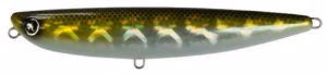 Wtd Seaspin Pro-Q 120. Topwater per spinning in mare molto facile da usare, forma curve strette e rapide se recuperato normalmente rispondendo molto prontamente alle sollecitazioni del pescatore, mentre crea curve molto larghe se recuperato lentamente. Oltre al movimento laterale si distingue anche per un particolare movimento alto-basso molto stimolante nei confronti dei predatori. Quest’ultimo movimento può essere favorito, o annullato, dall’azione del pescatore. L’attenta distribuzione dei pesi e il profilo appositamente studiato di queste esche Seaspin permettono lanci molto lunghi. Il rattling è piuttosto sordo e prodotto dalle sfere interne parzialmente libere di muoversi. Per i colori si spazia dai naturali al trasparente, al glow. Non mancano anche qui l’armatura interna passante e le ancorette rinforzate. Indicato per tutti i predatori che attaccano in superficie come spigole, pesci serra, barracuda, lecce, lampughe.