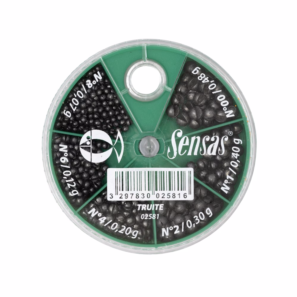 Scatola Standard Trota Sensas, Scatola che raccoglie i pallini più utilizzati per catturare le trote. 6 taglie disponibili: n. 8, n. 6, n. 4, n. 2, n. 1 e n. 00.