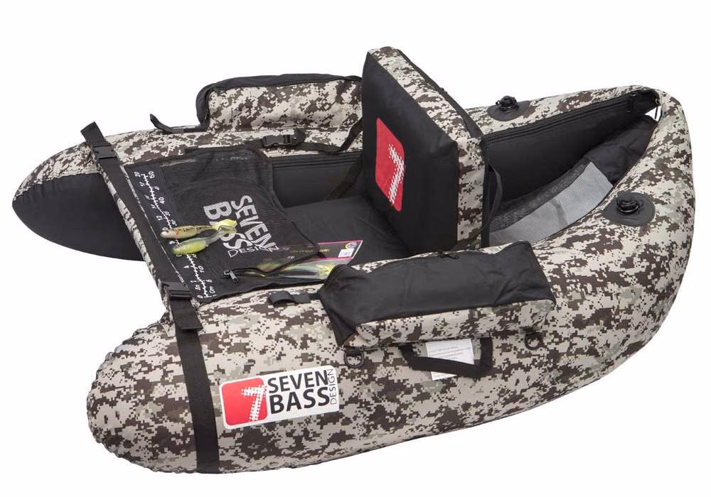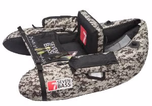 Seven Bass One Renegade. Seven Bass Design’s the “One RENEGADE” is available in desert camouflage and weighs just 4.5kg/8lbs. This kick boat model is equipped with all the essentials for anglers new to the sport of float tube fishing. Two vinyl air chambers and seat inserts are quick to install. The seat and air chambers are inflated separately to ensure maximum safety. Once inflated, novices to kick boating will be riding high on the water and feeling comfortably secure. Equipment and tackle can be stored in the large attached side bags, the open space behind the seat, or in our unique pocket apron.