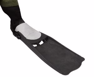 Le maintien du pied se fait sur la partie avant dans un chausson en caoutchouc, tandis qu’une sangle réglable vient maintenir l’ensemble en passant derrière le talon. Le battoir est en caoutchouc thermoplastique pour permettre une excellente poussée tout en garantissant une haute efficacité afin de réduire la fatigue des jambes, mais également pour une plus grande longévité.
