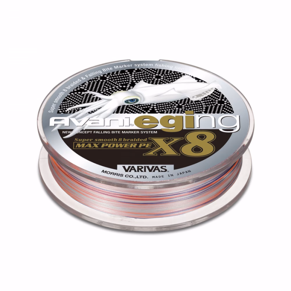 Avani Eging Max Power PE X8. Il Varivas Avani Eging Max Power PE X8 è il nuovo filo trecciato da eging ad 8 capi studiato appositamente prodotto da Varivas e considerata tra le trecce da Eging top, permette al pescatore di portare a proprio vantaggio il combattimento. La treccia risulta molto rotonda e scorrevole grazie al nuovo trattamento SPF alla fluorina che riduce l'attrito con gli anelli e la possibilità di parrucche consentendo di effettuare lanci molto più lunghi e precisi. Grazie al sistema di marking, è possibile capire esattamente quanto si sta recuperando la totanara dal fondo così da poterne regolare il movimento al massimo. Ogni 2 metri infatti, la colorazione bianca del PE viene intervallata da 50 centimetri di colore arancione che possiede 10 centimetri di colore viole per lato.