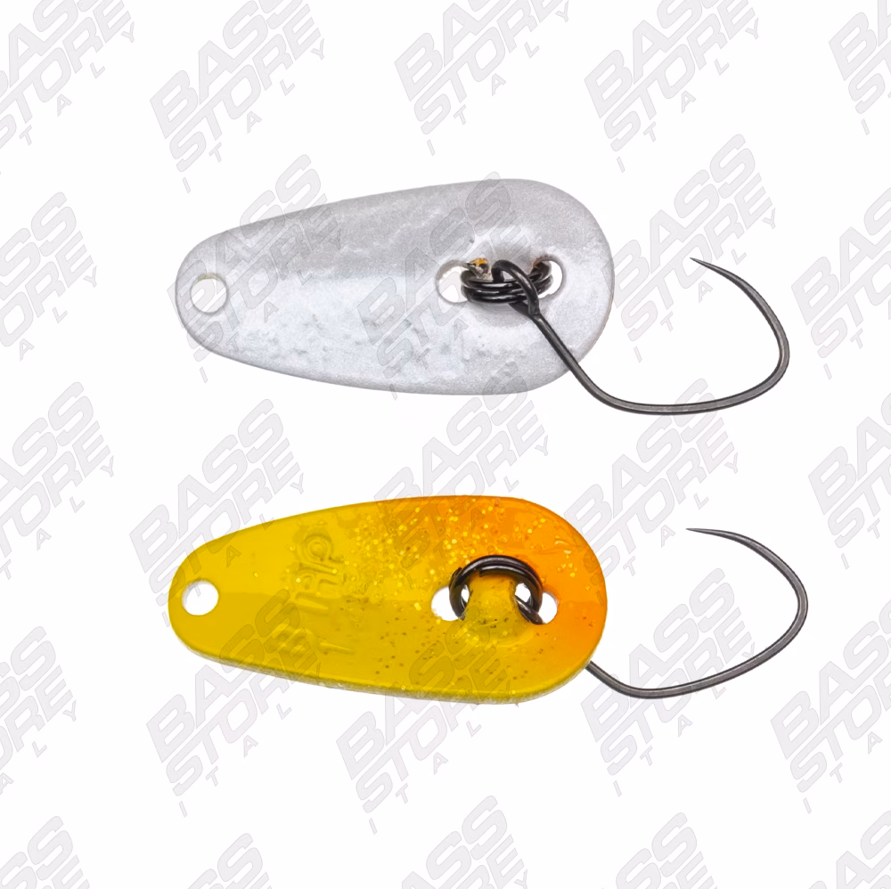 Ondulanti giapponesi Yarie B-Tap spoon. Spoon da trout Area Game Yarie specifici per la pesca a spinning della trota in laghetto quando si nutre in prossimità del fondo o attacca ondulanti presentati in verticale. Montati con ami singoli senza ardiglione in posizione strategica per la pesca sul fondo, e per "ferrare" in modo immediato le trote che mangiano nervosamente, non prendendo l'ondulante del tutto in bocca.