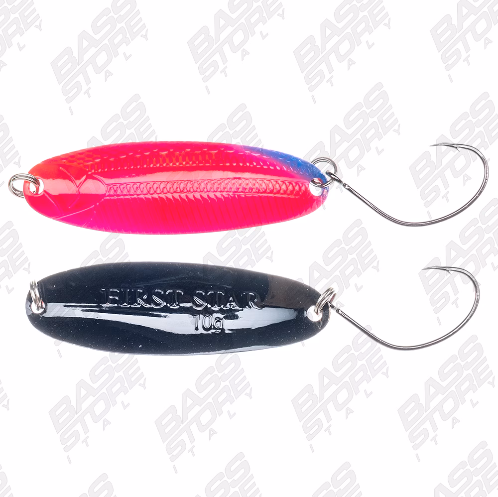 Yarie First Star spoon. Ondulante specifico per la pesca della trota in fiume o in torrenti a grande portata, ideato per essere lanciato con precisione con lanci laterali, o a distanza con lanci frontali. Lo Yarie First Star è caratterizzato da colorazioni estremamente efficaci sulle trote "native", e resta in corrente, ondeggiando sinuosamente dopo la caduta o quando trattenuto. La vernice è strutturata per resistere quanto più possibile a graffi su rocce e simili, ed è armato con un amo singolo adatto anche ad esemplari di taglia. Specifico per acque torrentizie o fluviali come il "fratello minore" First Order è anche un ottimo spoon per chi ama la trout area alla ricerca di big posizionate a distanza in laghi grandi, o per chi cerca trote lacustri. Dotato di amo singolo con micro ardiglione.