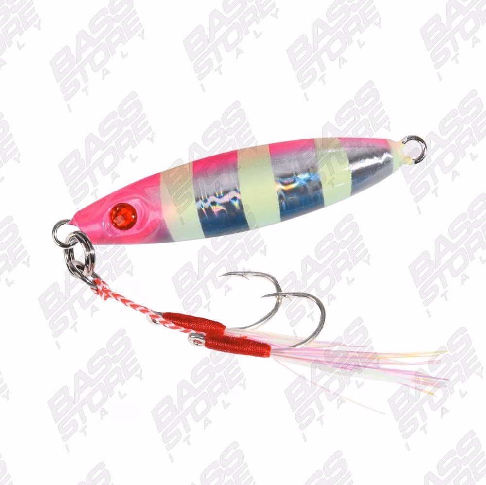 Round-bodied, asymmetrical jig-cast rigged with a double assist hook in the front. Its colors and reflections make it perfect for attracting sea predators in drop shot fishing or casting